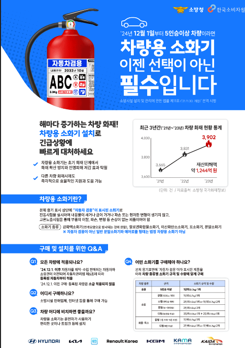 우리나라에서는 특정 차량에 대해 차량용 소화기 설치가 의무화되어 있습니다.