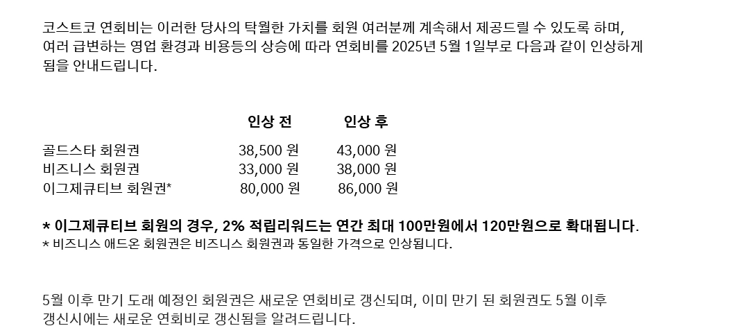 * 회원 혜택 확대: 코스트코는 연회비를 통해 회원들에게 추가적인 혜택을 제공하는데, 할인 폭 확대, 새로운 브랜드 입점 등의 서비스를 유지하기 위해 비용 조정이 필요합니다.