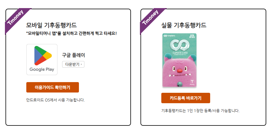 기후동행카드는 모바일카드와 실물카드 두 가지 형태로 제공되며, 신청 방법은 다음과 같습니다.