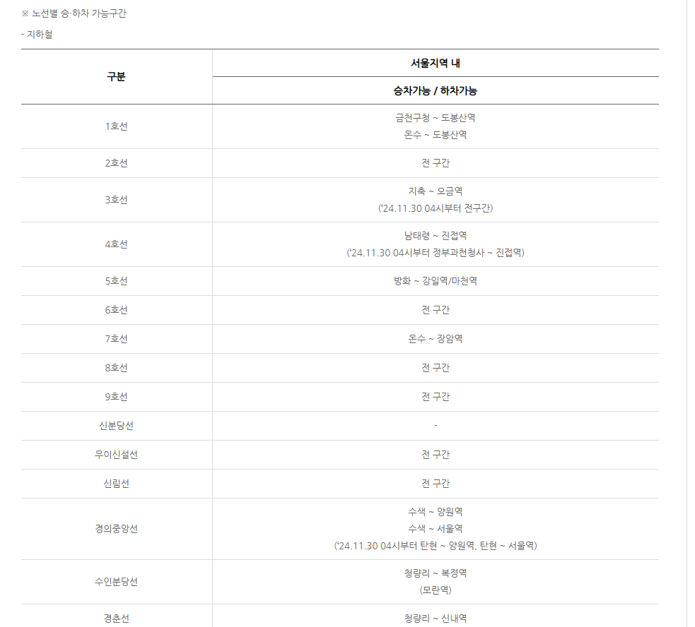서울 지역 내 지하철 노선에서 이용 가능합니다. 다만, 신분당선 등 일부 노선은 제외되므로 사전에 확인이 필요합니다.