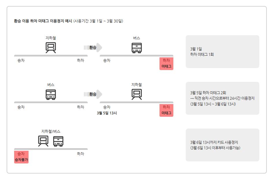 2. 하차 태그 필수: 버스 이용 시 하차 태그를 반드시 해야 합니다. 하차 태그를 누락하면 2회 이상 발생 시 카드 사용이 일시적으로 정지될 수 있습니다.