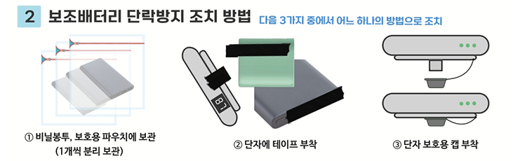 * 보조배터리의 단자가 금속과 접촉하지 않도록 절연테이프로 단자를 감싸기
