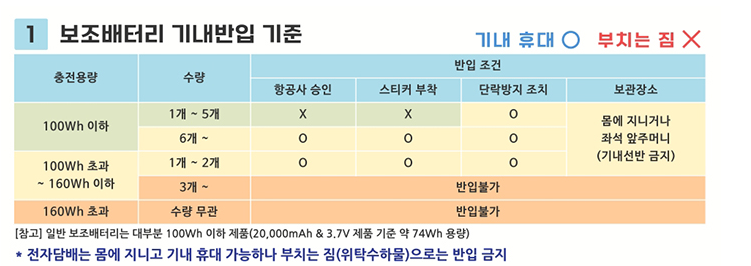 >>> 100Wh 이하: 최대 5개까지 반입 가능
