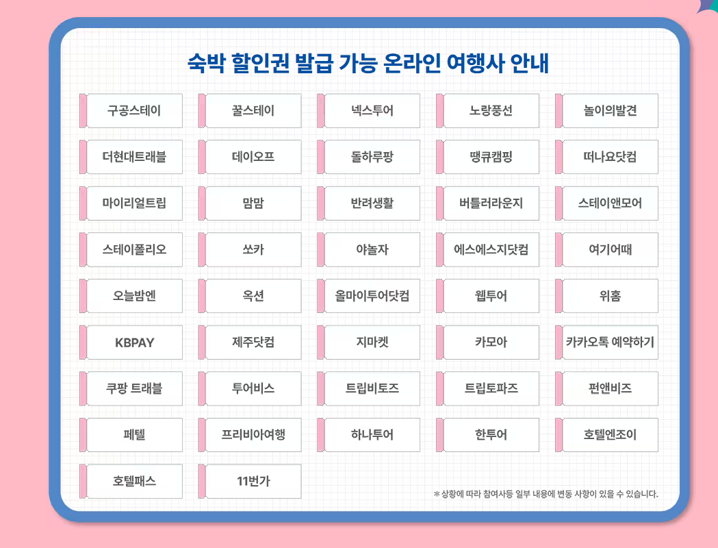 [공구스테이, 꿀스테이, 넥스투어, 노랑풍선, 놀이의발견, 더현대트래블, 데이오프, 돌하루팡, 땡큐캠핑, 떠나요닷컴, 마이리얼트립, 맘맘, 반려생활, 버틀러라운지, 스테이앤모어, 스테이폴리오, 쏘카, 야놀자, 에스에스지닷컴, 여기어때, 오늘밤엔, 옥션, 올마이투어닷컴, 웹투어, 위홈, KBPAY, 제주닷컴, 지마켓, 카모아, 카카오톡 예약하기, 쿠팡 트래블, 투어비스, 트립비토즈, 트립토파즈, 펀앤비즈, 페텔, 프리비아여행, 하나투어, 한투어, 호텔엔조이, 호텔패스, 11번가]