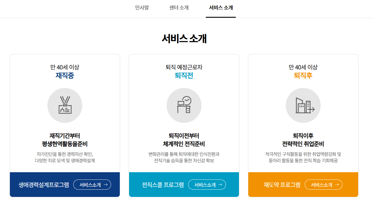 ㅁ 이 센터는 중장년층이 기존의 경력을 살려 재취업할 수 있도록 도우며, 새로운 도전과 전환을 원할 경우에는 체계적인 지원을 통해 안정적인 미래를 설계할 수 있도록 돕습니다.