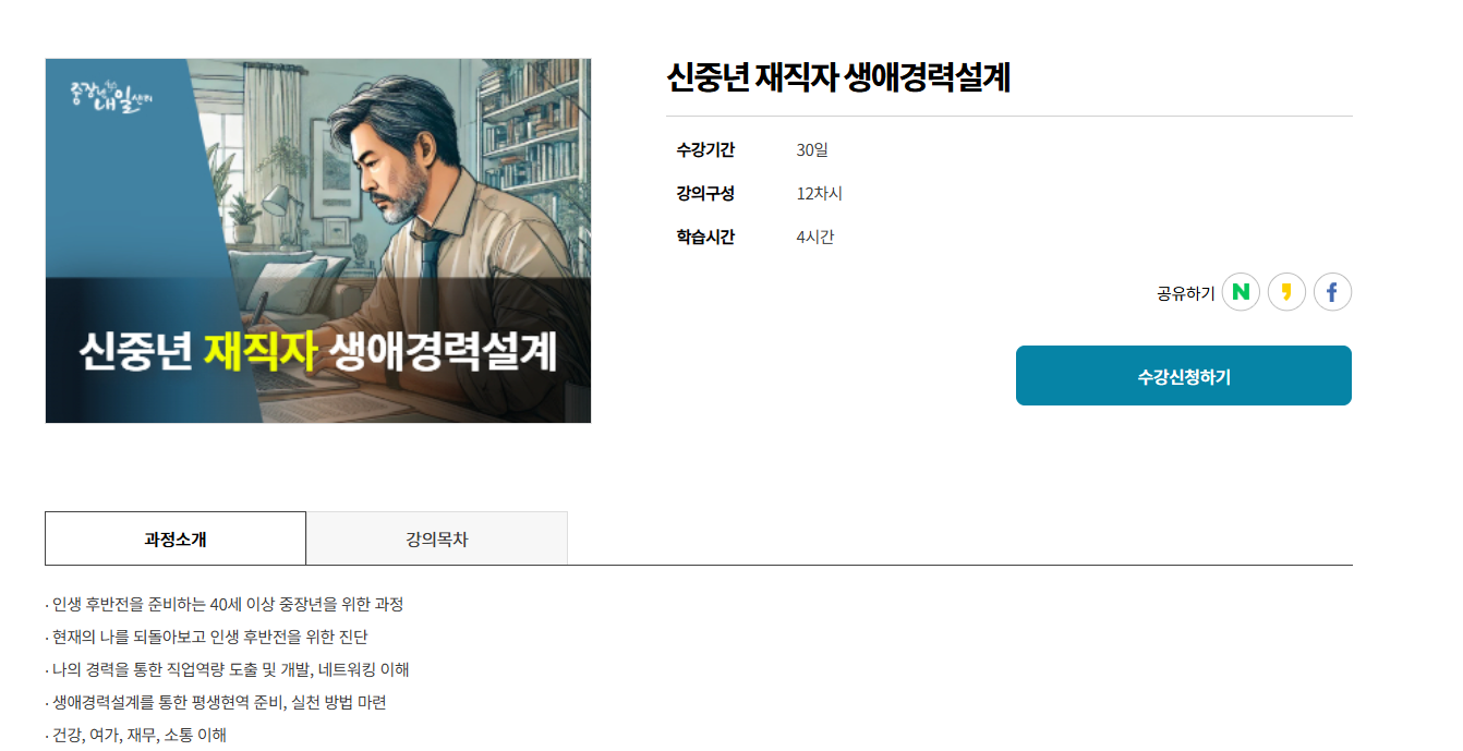그런 분들에게 도움이 될 '중장년 내일센터'에 대해 소개 해 드릴께요. 듣고 싶으신 강의도 들으면서 인생 2막을 설계해 보실 수 있으실 거예요.